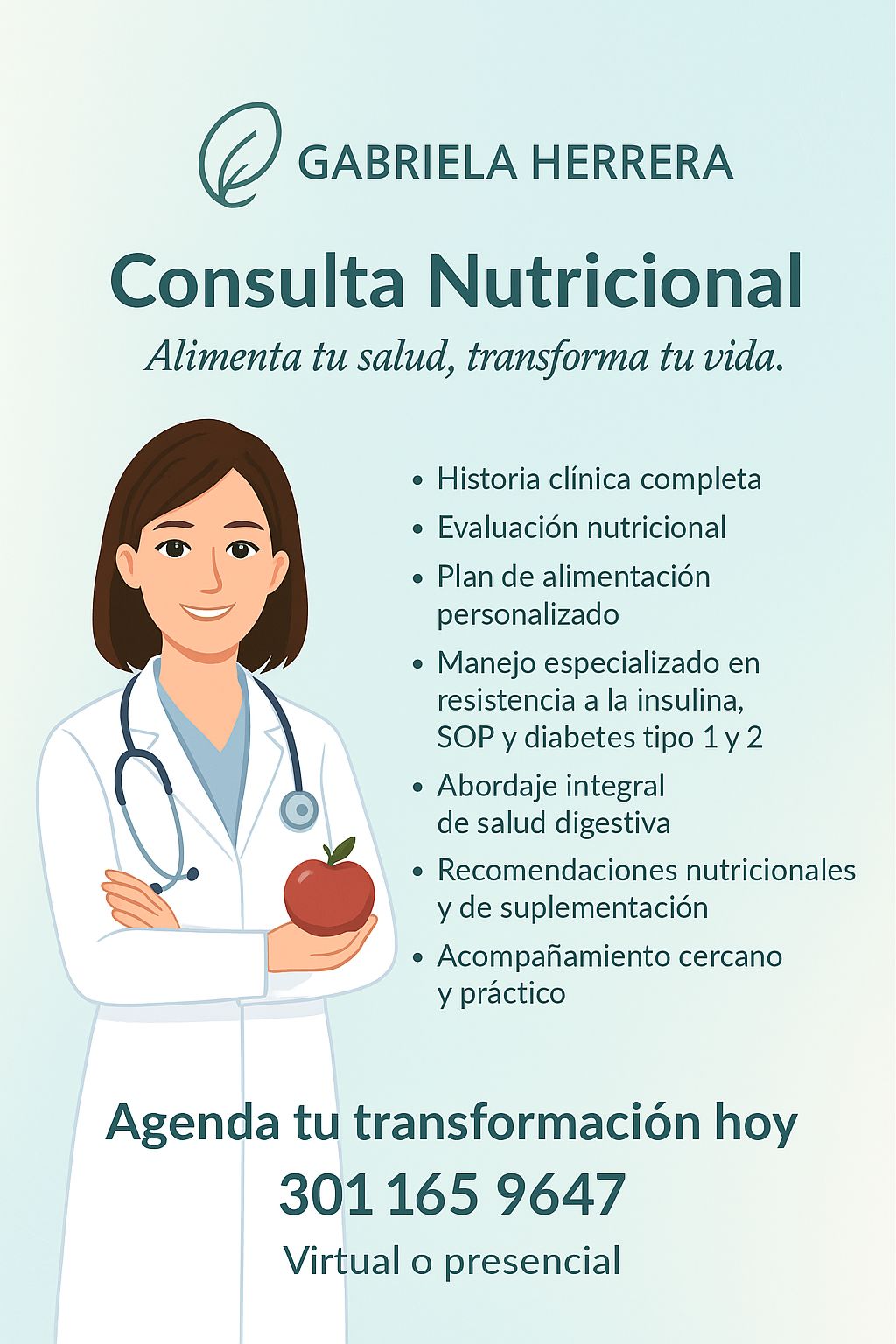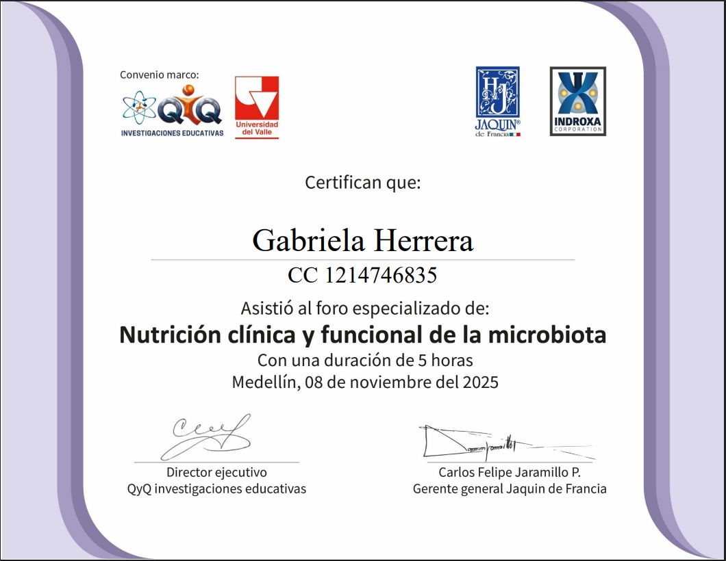 Soy nutricionista dietista con experiencia en el tratamiento de enfermedades crónicas y condiciones como resistencia a la insulina, diabetes mellitus tipo 1 y 2 (incluyendo conteo de carbohidratos), síndrome de ovario poliquístico y enfermedades digestivas. Mi propósito es brindar una atención cercana, personalizada y basada en evidencia científica, ayudando a cada paciente a transformar su salud desde la raíz y a mejorar su calidad de vida con planes de alimentación prácticos, sostenibles y adaptados a sus necesidades.